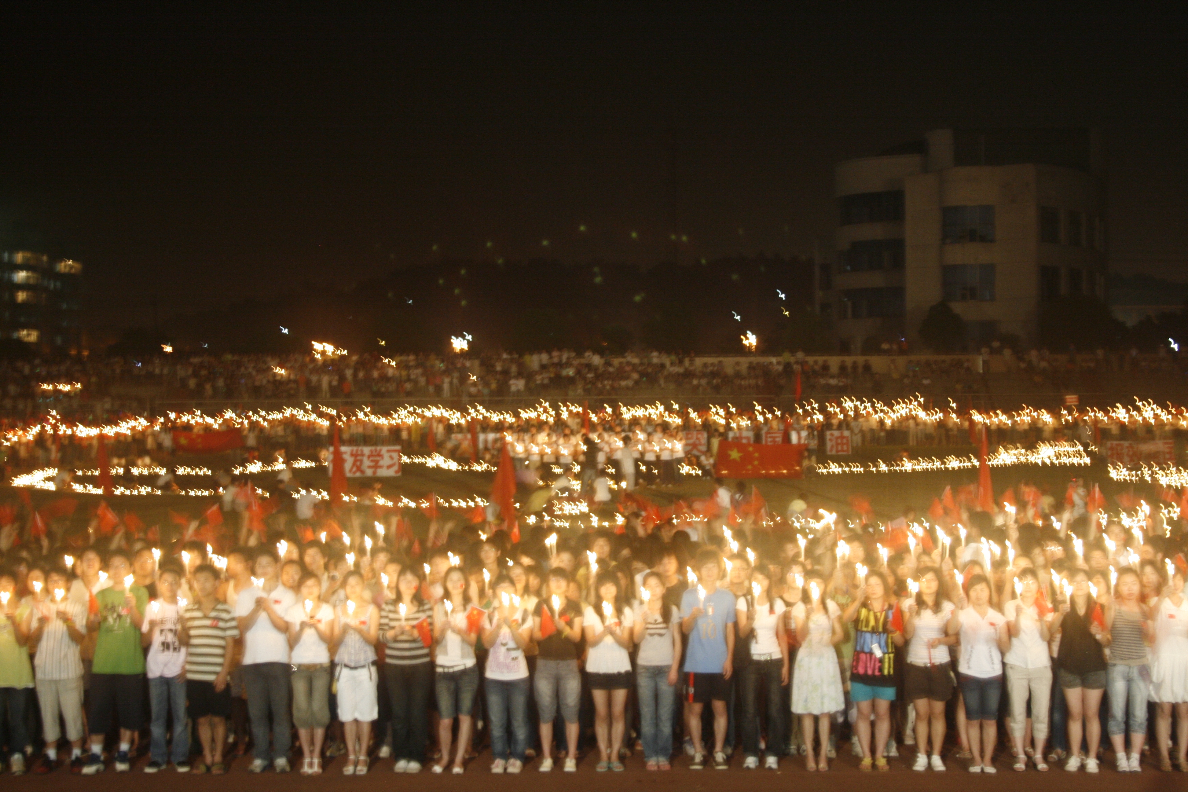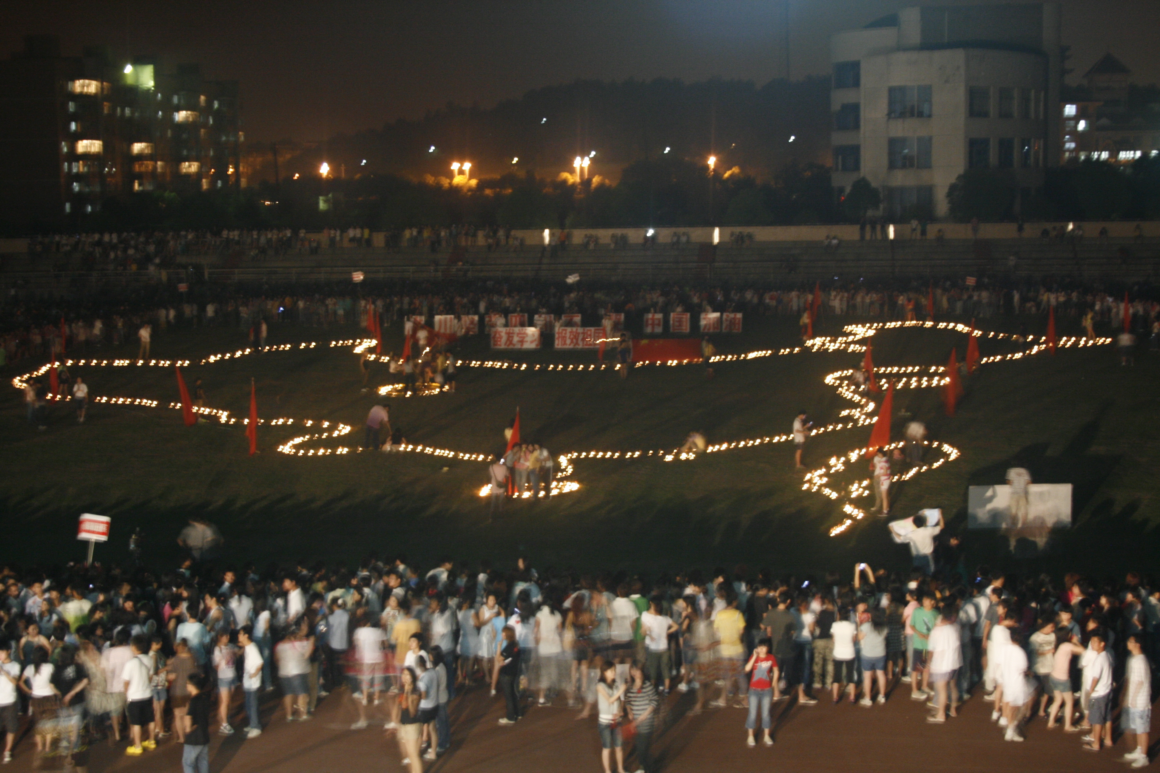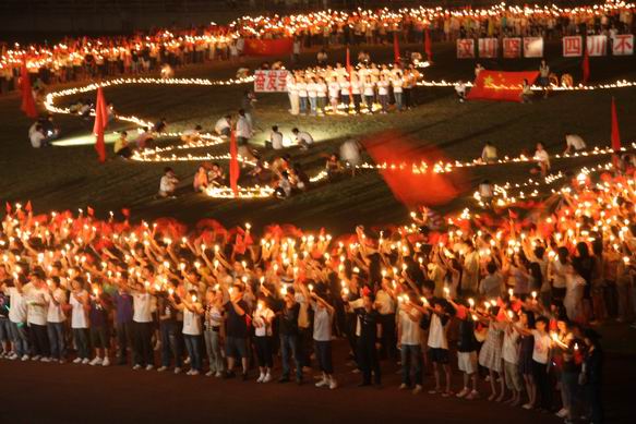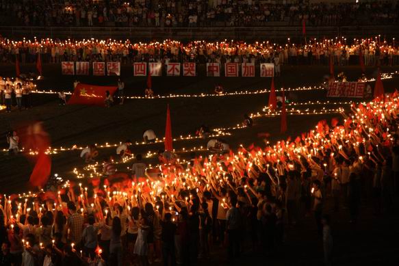 22时30分,田径场正中央,由动漫与艺术设计系师生用数千只蜡烛勾勒成的中国版图分外明亮,在四川省汶川县的位置上安放着一束束寄托着传媒师生们无限哀思的黄菊花,衣着朴素的传媒学子手持蜡烛,挥舞国旗,围成巨形方阵,纵情高唱《我的中国心》、《歌唱祖国》,齐声朗诵《少年中国说》等,用这种特殊的形式来表达着传媒师生对汶川地震罹难同胞们的无限哀思,同时告诉灾区的同胞们,擦干眼泪、坚强同行,我们永远在一起。