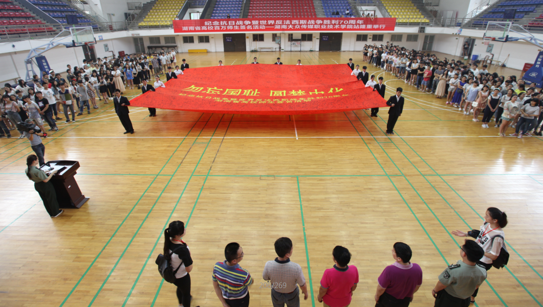 5月26日下午,纪念抗日战争暨世界反法西斯战争胜利70周年湖南高校百万师生巡回签名活动,在我院体育馆隆重进行。院领导戚人杰、刘国清、湖南教育电视台副台长甘大志等出席活动,来自管理学院和视觉艺术学院的500余名师生参加了本次活动。