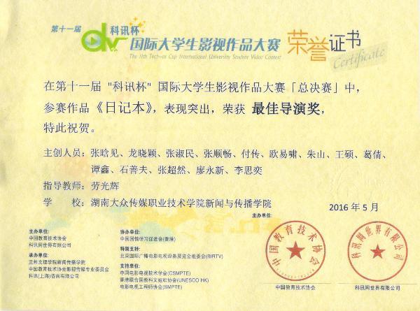 5月28日,由科讯网世界有限公司与中国教育技术协会主办的第十一届“科讯杯”国际大学生影视作品大赛颁奖典礼在兰州举行,由新闻与传播学院选送的欧易啸团队作品《日记本》脱颖而出,获得大赛中南赛区一等奖和总决赛最佳导演奖。