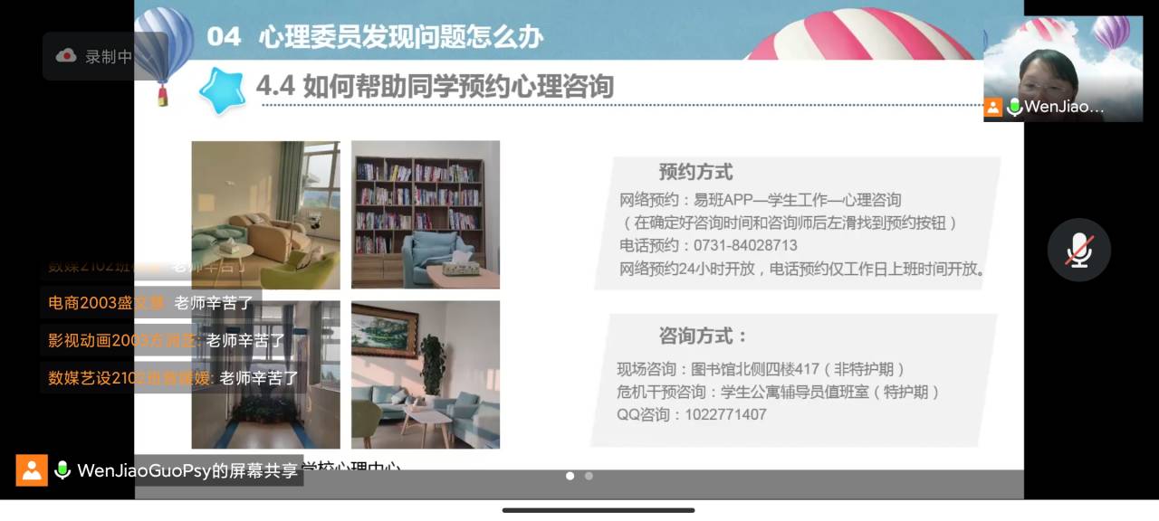 讲座分为“你为何选择成为心理委员”、“心理委员可以做什么”、“心理委员如何发现问题”和“心理委员发现问题怎么办”四个主题。针对这些话题,师生在线进行了热烈地讨论。