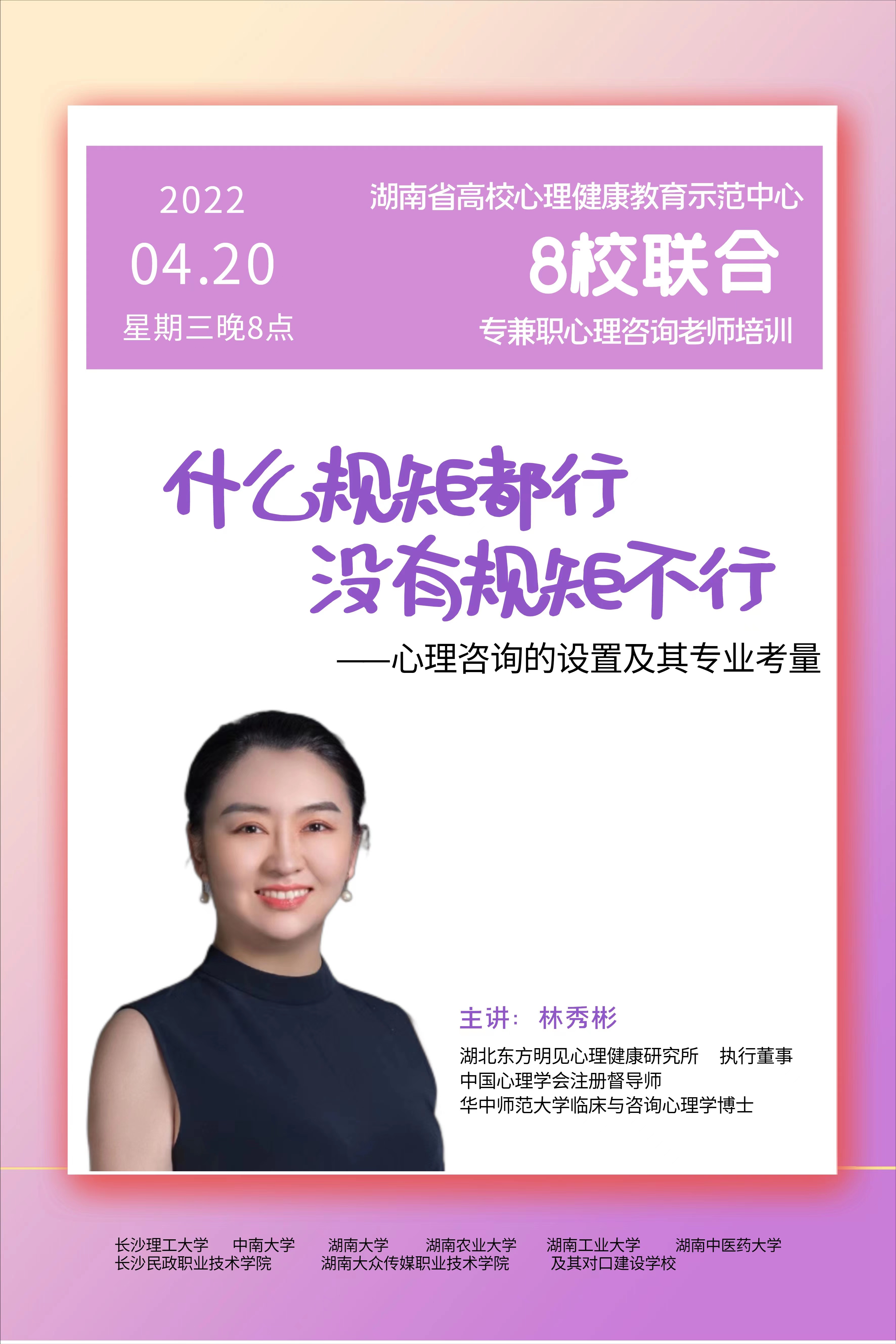 2022年4月20日晚,我院与长沙理工大学、中南大学等八所高校联合开展专兼职心理咨询教师培训。本次培训主题为“什么规矩都行,没有规矩不行——心理咨询的设置及其专业考量”。培训邀请美国雷德兰兹大学特聘教授、华中师范大学临床与咨询心理学博士、中国心理学会注册系统心理师林秀彬老师主讲。湖南省心理健康教育研究会秘书长、长沙理工大学心理健康教育中心主任龚勋副教授主持会议,近260名高校专兼职心理咨询师聆听了讲座。
