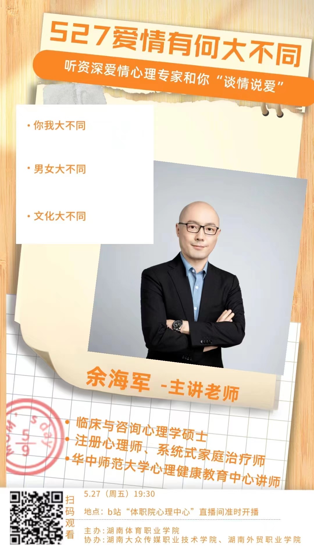 2022年5月27日,由湖南体育职业学院主办,湖南大众传媒职业技术学院、湖南外贸职业技术学院协办的“爱情大不同”讲座以线上线下相结合的形式顺利召开。我们有幸邀请到了华中师范大学的余海军老师作为这次讲座的主讲人。