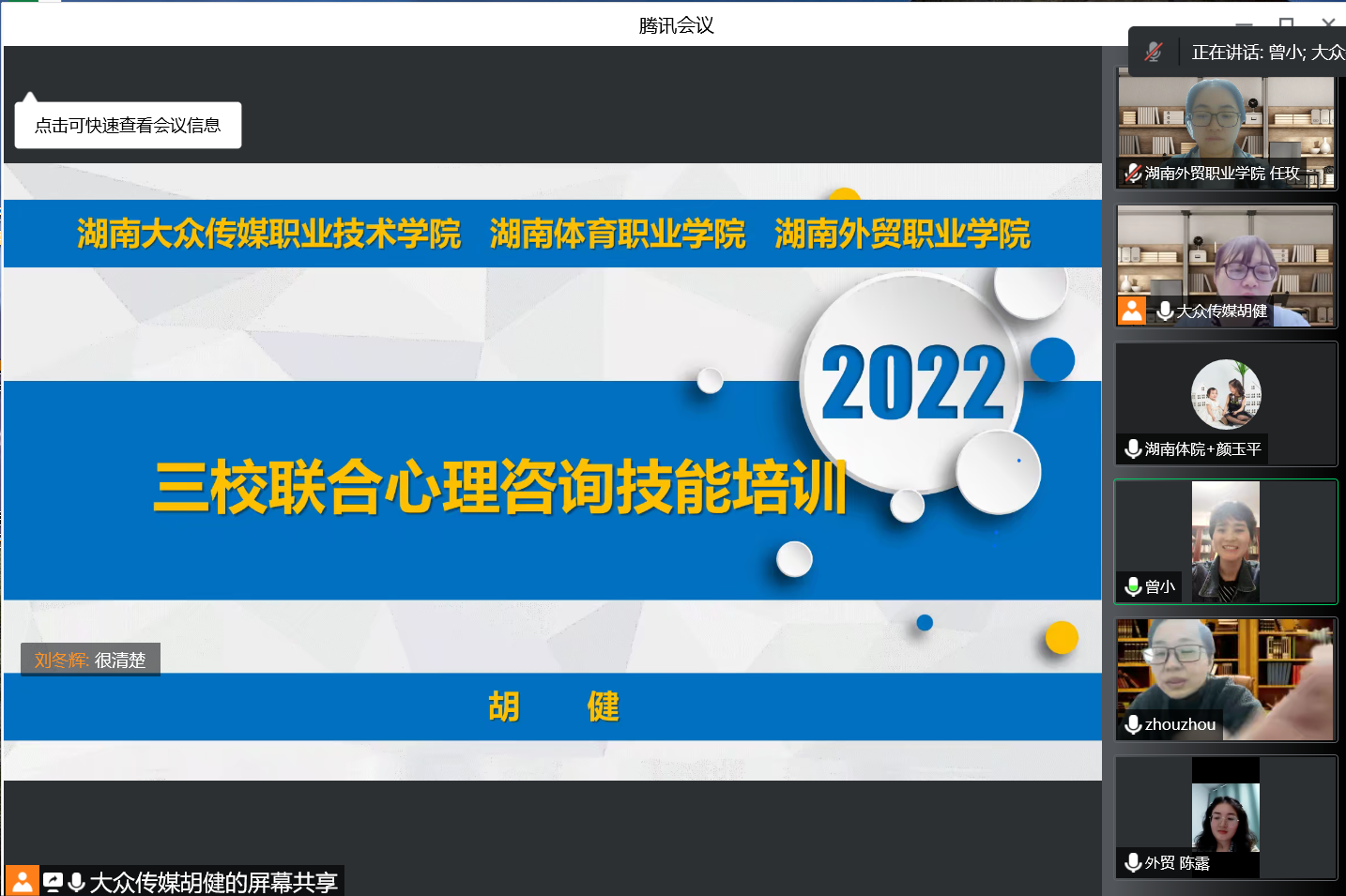 11月7日晚上,我院与湖南省心理健康教育示范中心对口协作学校湖南体育职业学院、湖南外贸职业学院开展三校联合心理咨询技能培训,心理健康教育与咨询中心主任胡健主讲,三校30余名专兼职心理咨询师齐聚腾讯会议室。