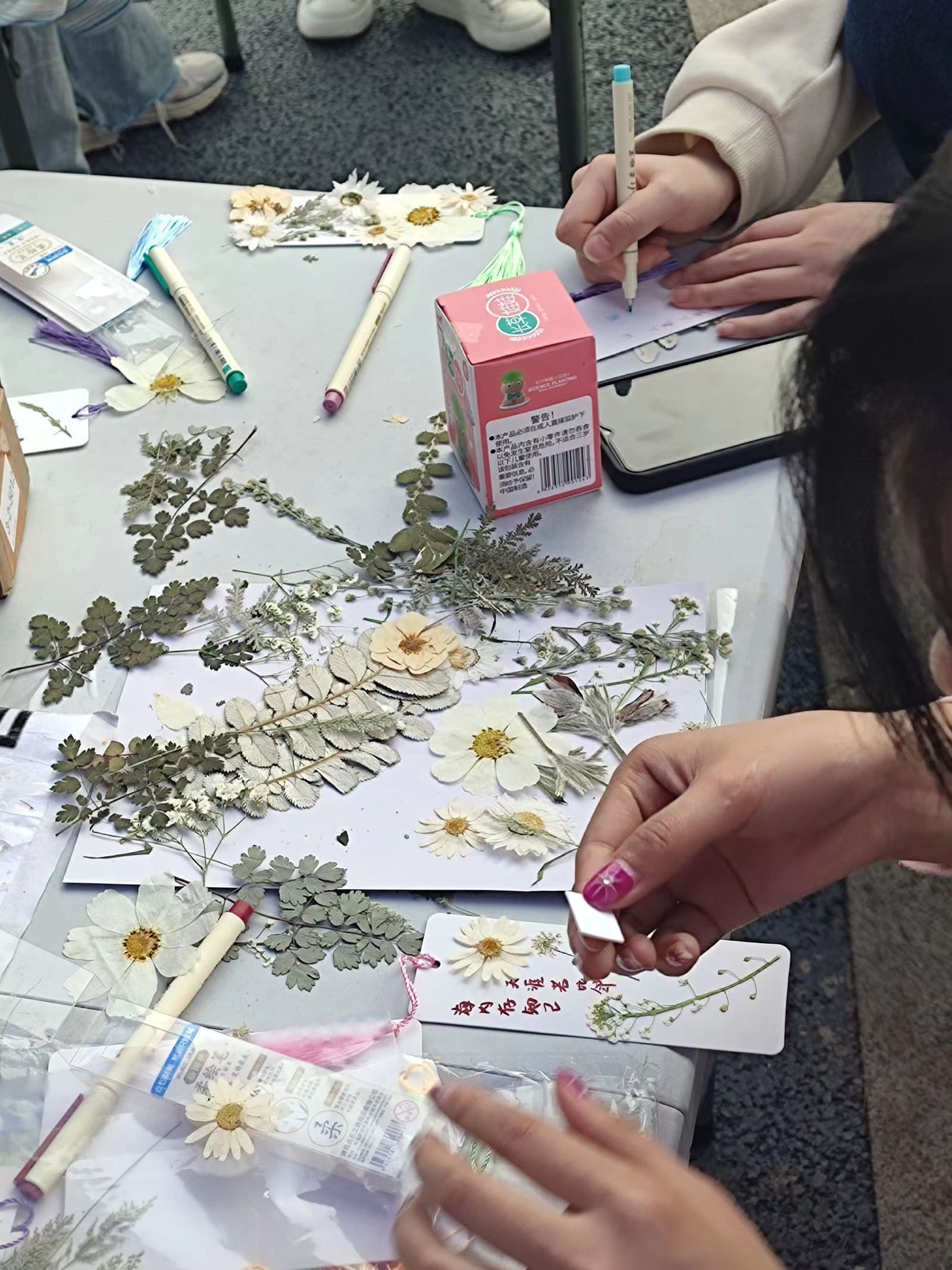 干花书签制作和植物辨识活动也受到全校同学的喜欢,大家在书签上写满保护绿植的宣传语,增长知识的同时通过领养盆栽,与绿色亲密接触。