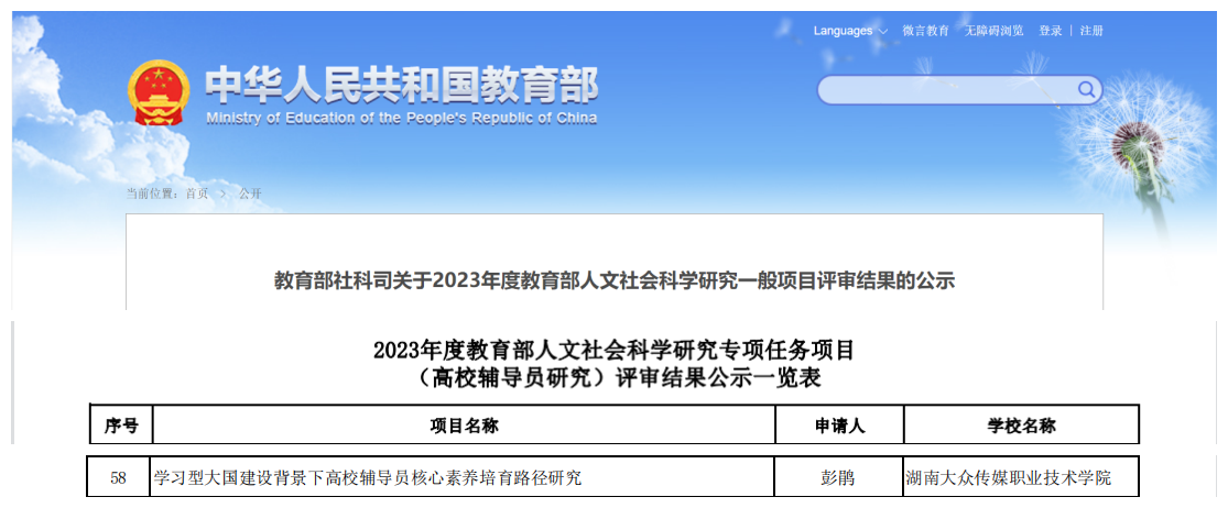 近日,教育部社会科学司公布了2023年度教育部人文社会科学研究专项任务项目(高校辅导员研究)立项结果。我校管理学院辅导员彭鹃老师申报的《学习型大国建设背景下高校辅导员核心素养培育路径研究》获批立项。