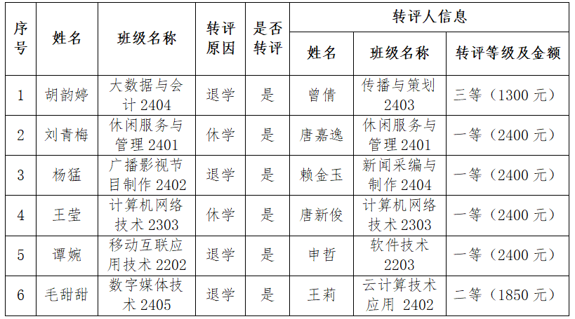 经核查,我校有六名学生已办理休学和退学手续,学籍状态已不符合国家助学金受助要求。所空缺名额经学生本人申请、班级民主评议、二级学院初审、学生工作部复核、学校资助工作领导小组审定通过,拟推荐曾倩等6名学生为2024-2025学年春季学期国家助学金转评人选,具体名单如下:
