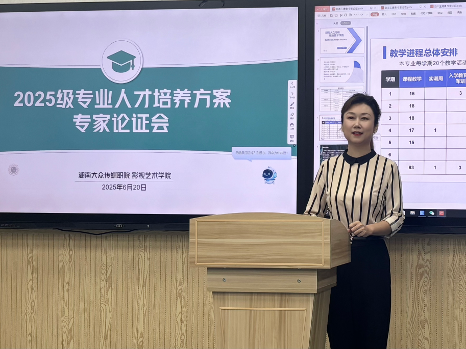 本次论证会由湖南大众传媒职业技术学院教务处副处长肖俊、湖南大众传媒职业技术学院督导专家田芳教授影视艺术学院院长李祖仕以及影视艺术学院副院长蒋丽芬担任评审专家,各专业教研室主任参与讨论。