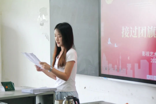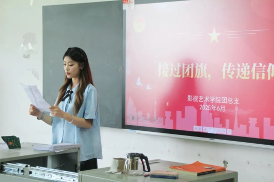 为筑牢团员青年思想根基,赓续共青团红色血脉,2025年6月25日,影视艺术学院团总支于艺术楼209室开展"接过团旗、传递信仰"主题团课。本次团课由影视艺术学院团总支书记陈杨屹捷主讲,第二党支部书记曹晓天、辅导员曾程威全程参与,21名新入团团员与团学骨干代表共赴这场意义非凡的青春之约。