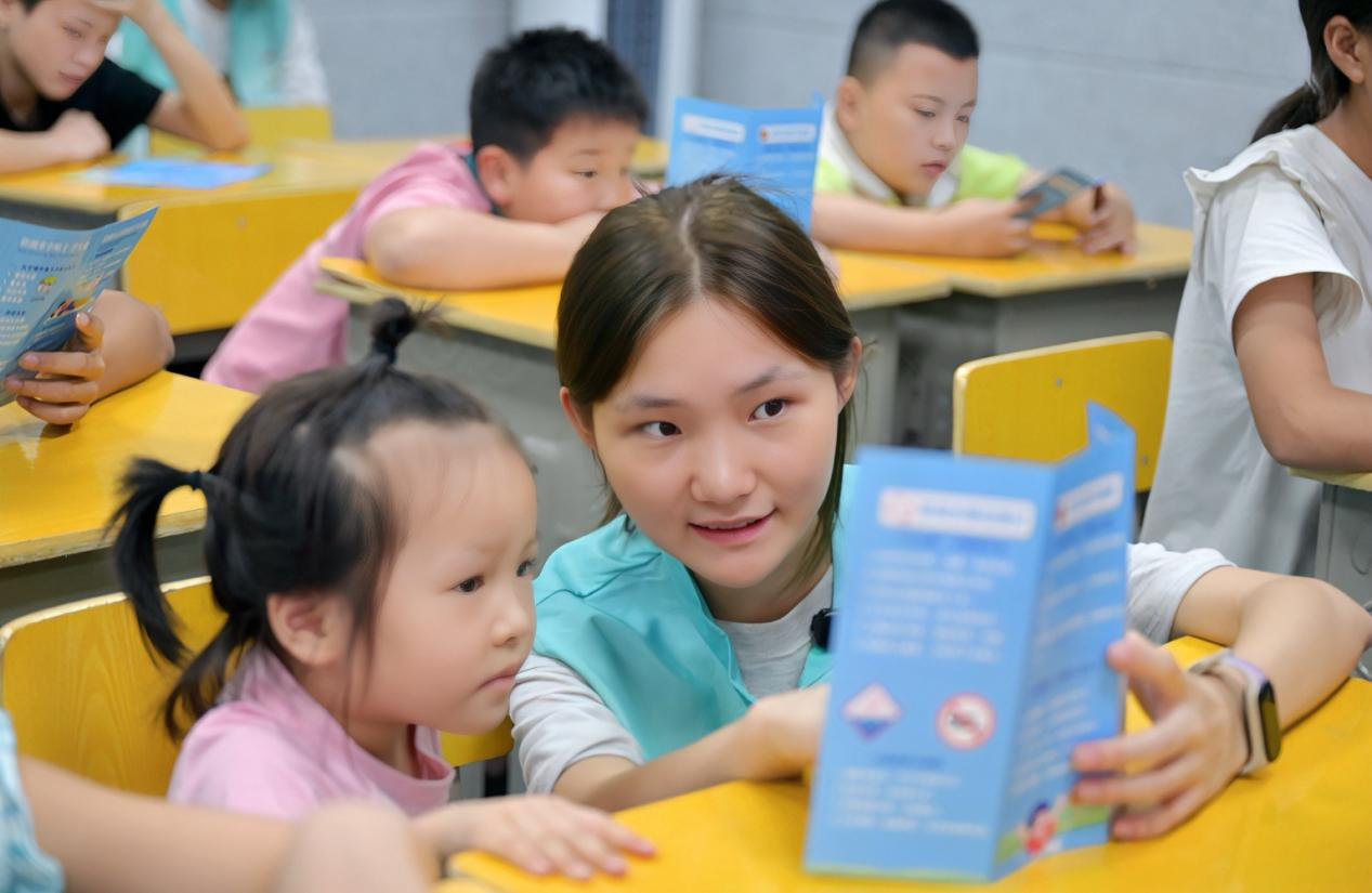 3:志愿者发放防溺水宣传手册,并为孩子们细致讲解防溺水知识