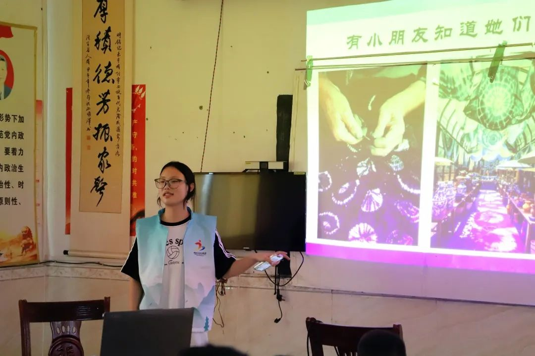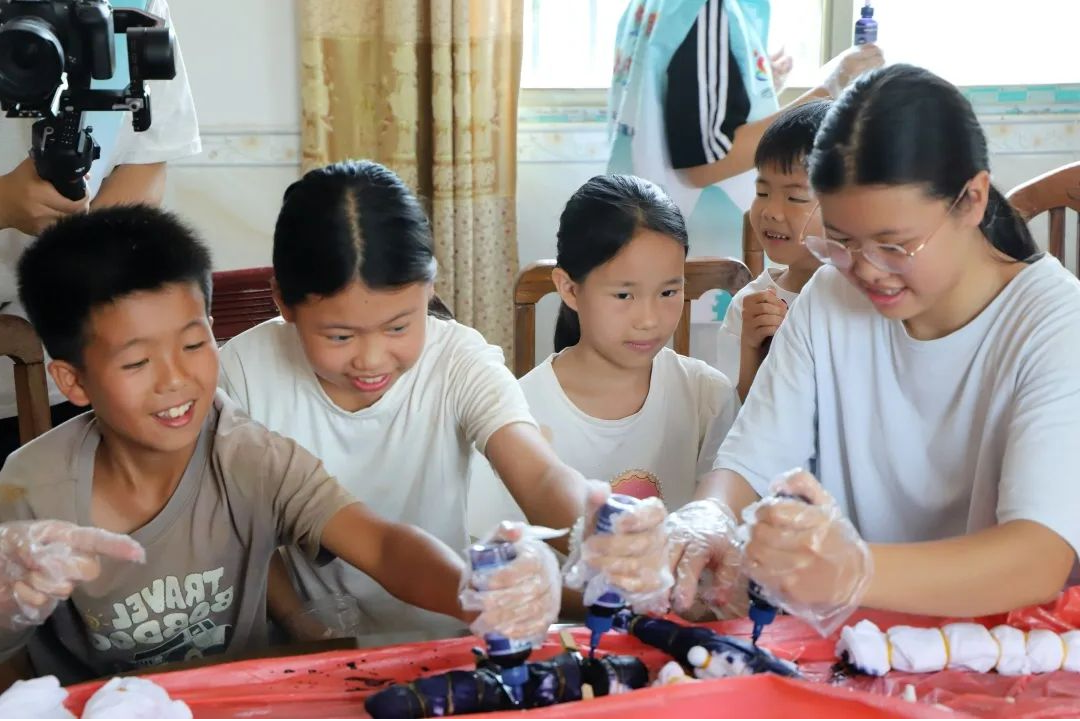 7月9日,国际传播学院“美美‘语’共”社会实践团队给舂陵江镇岩口村和柏家村的孩子们教授了点茶和扎染两项传统技艺。