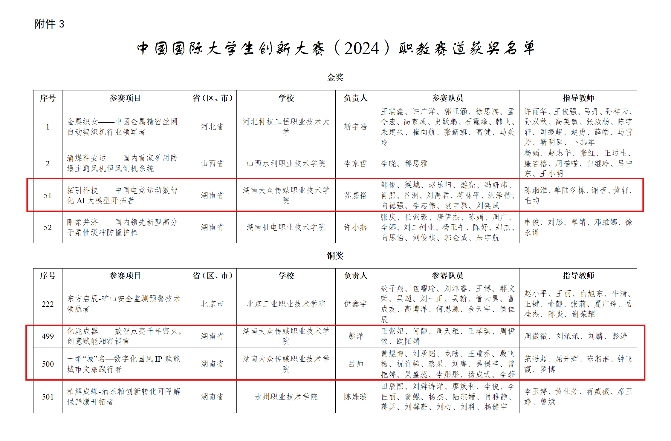 近日,教育部公布中国国际大学生创新大赛(2024)全国总决赛获奖名单,湖南大众传媒职业技术学院参赛团队师生凭借扎实的专业能力与创新思维,在这场高规格赛事中大放异彩,一举斩获金奖,刷新了我校在此项赛事中的最佳纪录。新媒体技术学院软件技术专业黄轩老师参与指导,参赛队员邹俊、游亮为软件技术专业学生。