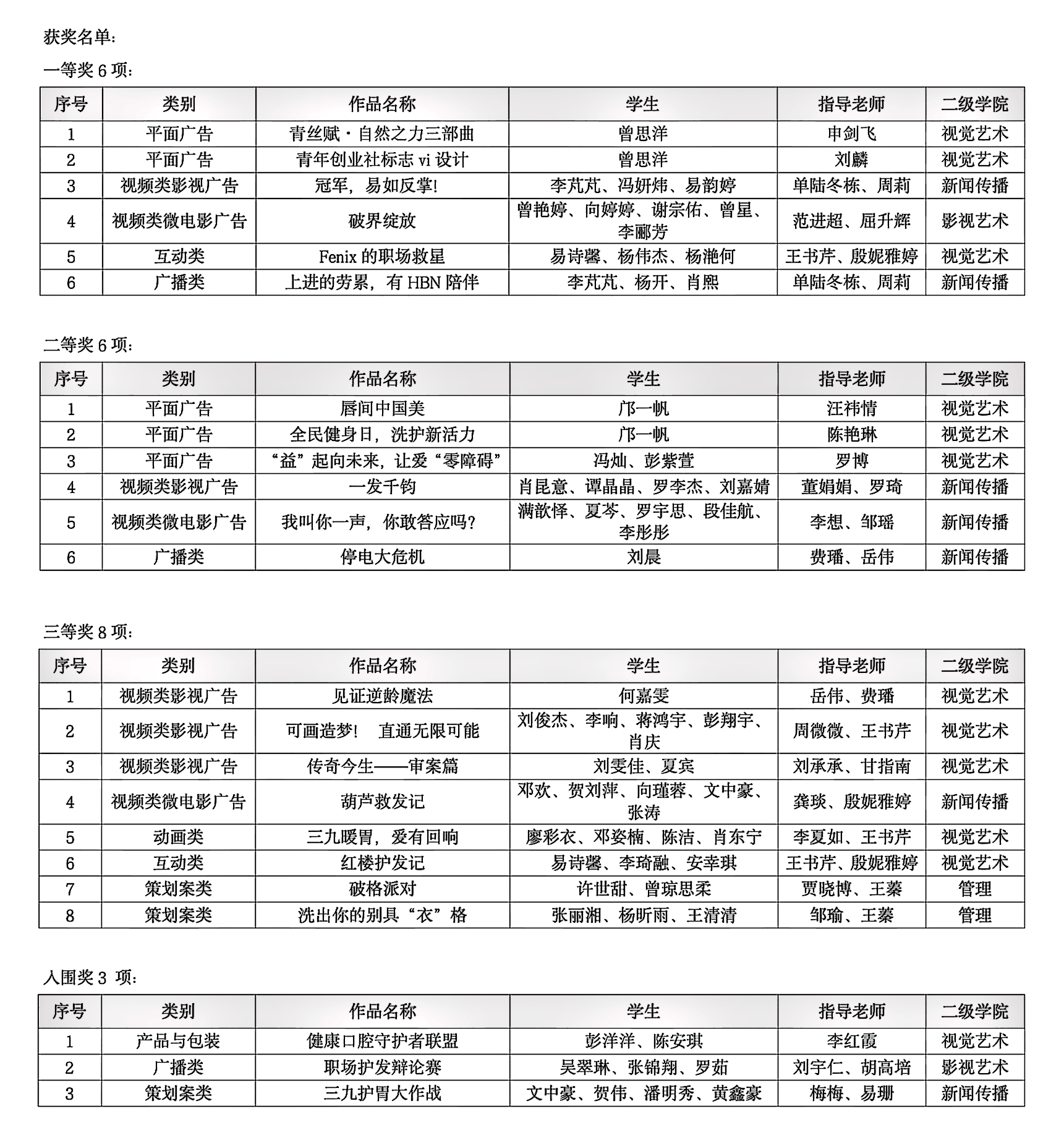 (教务处 供稿)近日,2025年度湖南省大学生广告艺术大赛暨第17届全国大学生广告艺术大赛湖南赛区选拔赛落下帷幕。我校选送的30件参赛作品表现突出,最终斩获省级一等奖6项、二等奖6项、三等奖8项、入围奖3项,共计23项作品成功获得国赛资格。