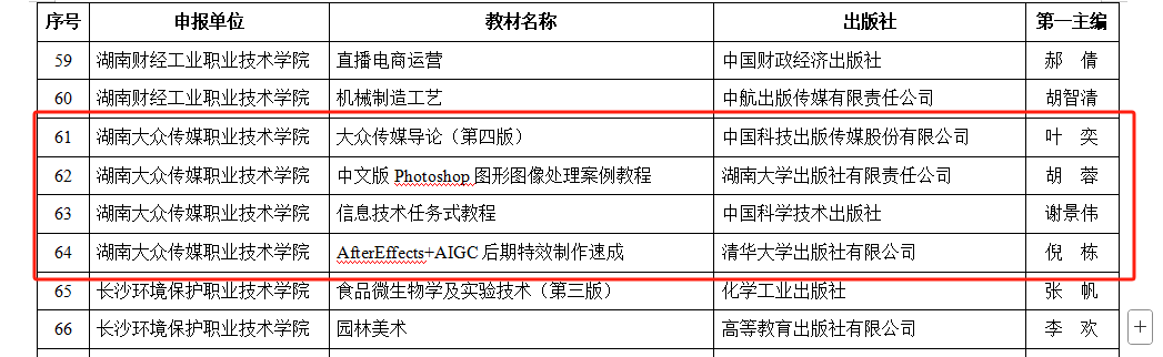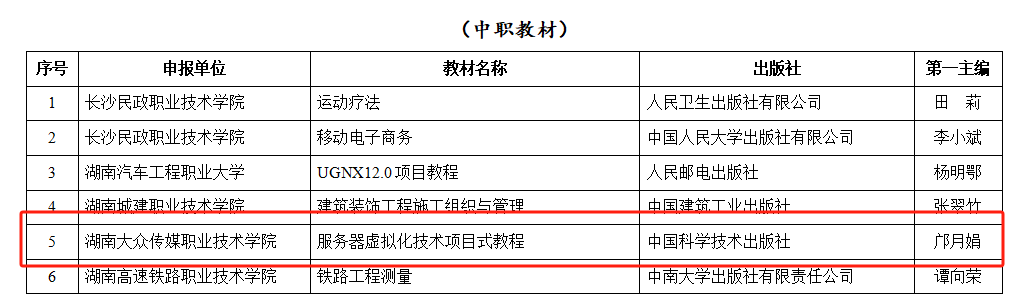 (教务处 易洁 供稿)近日,湖南省教育厅公布了2025年省职业教育优质教材认定结果,我校申报的《大众传媒导论(第四版)》等5种教材成功入选。目前学校共有12种教材入选省级优质教材,这是继学校4种教材入选首批“十四五”职业教育国家规划教材书目后教材建设的又一荣誉。