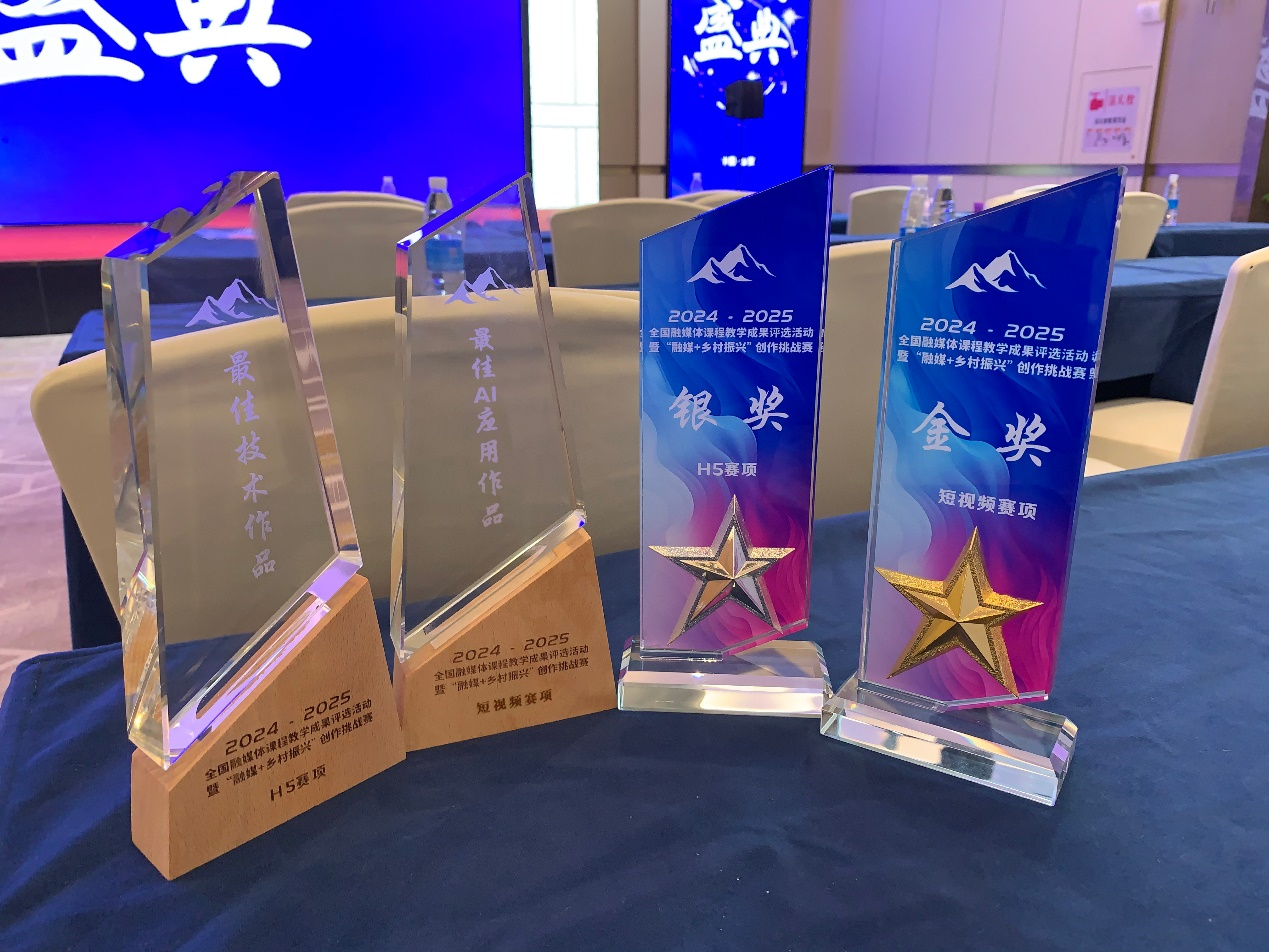 近日,2024-2025第三届全国高校融媒体课程教学成果评选活动暨“融媒+乡村振兴”创作挑战赛在山东泰安圆满落幕。我院以优异的成绩通过第一阶段作品选拔,从200多家高校中脱颖而出,成功晋级第二阶段。在第二阶段全国总决赛中,来自15家高校的参赛队经过激烈的角逐,新闻与传播学院董娟娟老师指导的参赛团队肖昆意、谭晶晶、曹清凭借出色的表现,斩获短视频赛项金奖、短视频赛项最佳AI应用奖、H5赛项银奖、H5赛项最佳技术奖四项大奖,展现了我院师生卓越的融媒创作实力与创新精神。