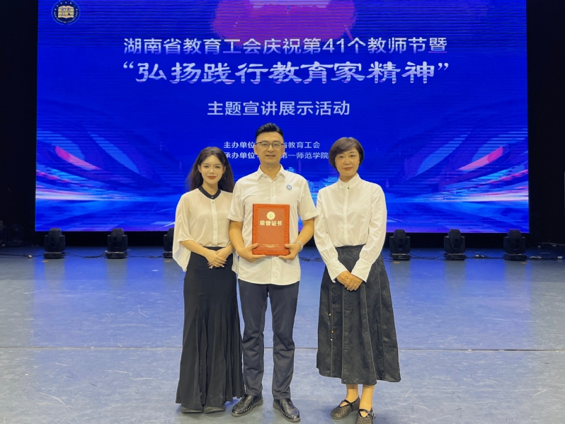 (工会办公室 袁瑾 供稿)9月5日,为庆祝第41个教师节,大力弘扬践行教育家精神,湖南省教育工会开展“弘扬践行教育家精神”主题宣讲展示活动。影视艺术学院易培老师代表我校参赛,凭借其出色表现荣获一等奖,为学校争得荣誉。