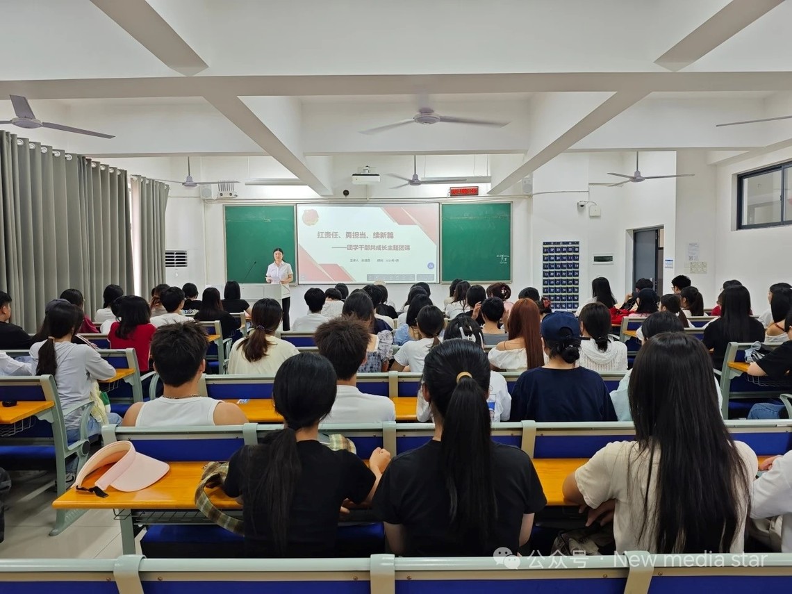秋光为序,征程新启。为全面激发团学会成员的工作热情,进一步提升学生组织的综合服务能力,2025年9月10日,新媒体技术学院团学会在理实一体化606教室举行新学期第一次团学工作会议。会上,团总支书记孙凌霖给全体团学干部带来一堂以“扛责任、勇担当、续新篇”为主题的团课,为新学期团学工作注入思想动力。