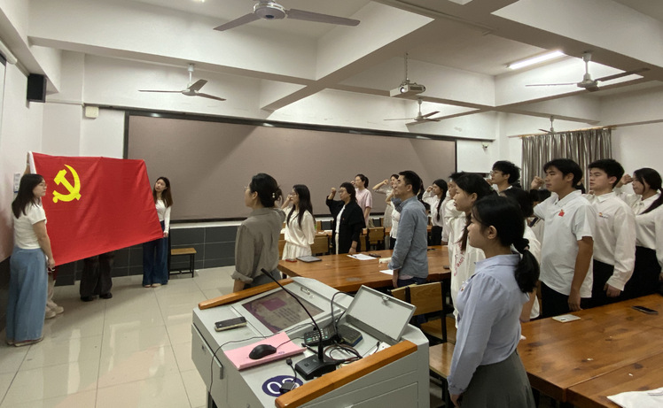会议第一项。全体成员起立,奏唱国歌,入党宣誓大会在庄严的歌声中正式开始。会议第二项,周洁副书记宣读参加宣誓的预备党员名单。会议第三项,新一批预备党员在领誓下,高举右拳,面向鲜红的党旗,向党发出了铮铮誓言:“我志愿加入中国共产党,拥护党的纲领,遵守党的章程,履行党员义务,执行党的决定,严守党的纪律,保守党的秘密,对党忠诚,积极工作,为共产主义奋斗终身,随时准备为党和人民牺牲一切,永不叛党”。话语间字字有力、句句铿锵,满含着对党的无限赤诚,让人倍感振奋。会议第四项。由学生代表和教师代表发言。学生表示将以画笔为媒、以设计为语,把红色基因融入创作,用艺术作品传递党的声音。教师代表则从育人初心出发,勉励新党员既要精进专业技能,更要坚守理想信念,在艺术道路上践行党员使命。
