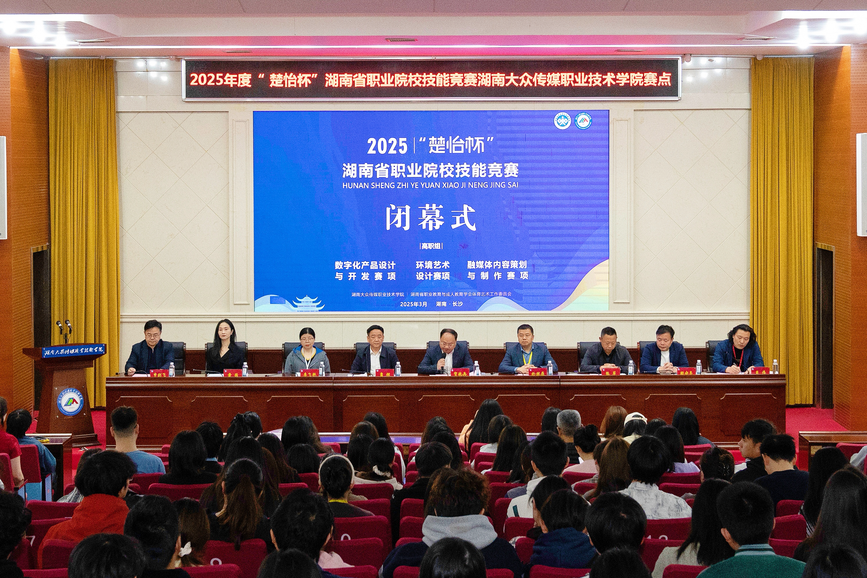 (教务处 肖俊 供稿)3月23日,2025年度“楚怡杯”湖南省职业院校技能竞赛湖南大众传媒职业技术学院赛点高职组环境艺术设计、数字化产品设计与开发、融媒体内容策划与制作3个赛项闭幕式在我校学术报告厅举行。