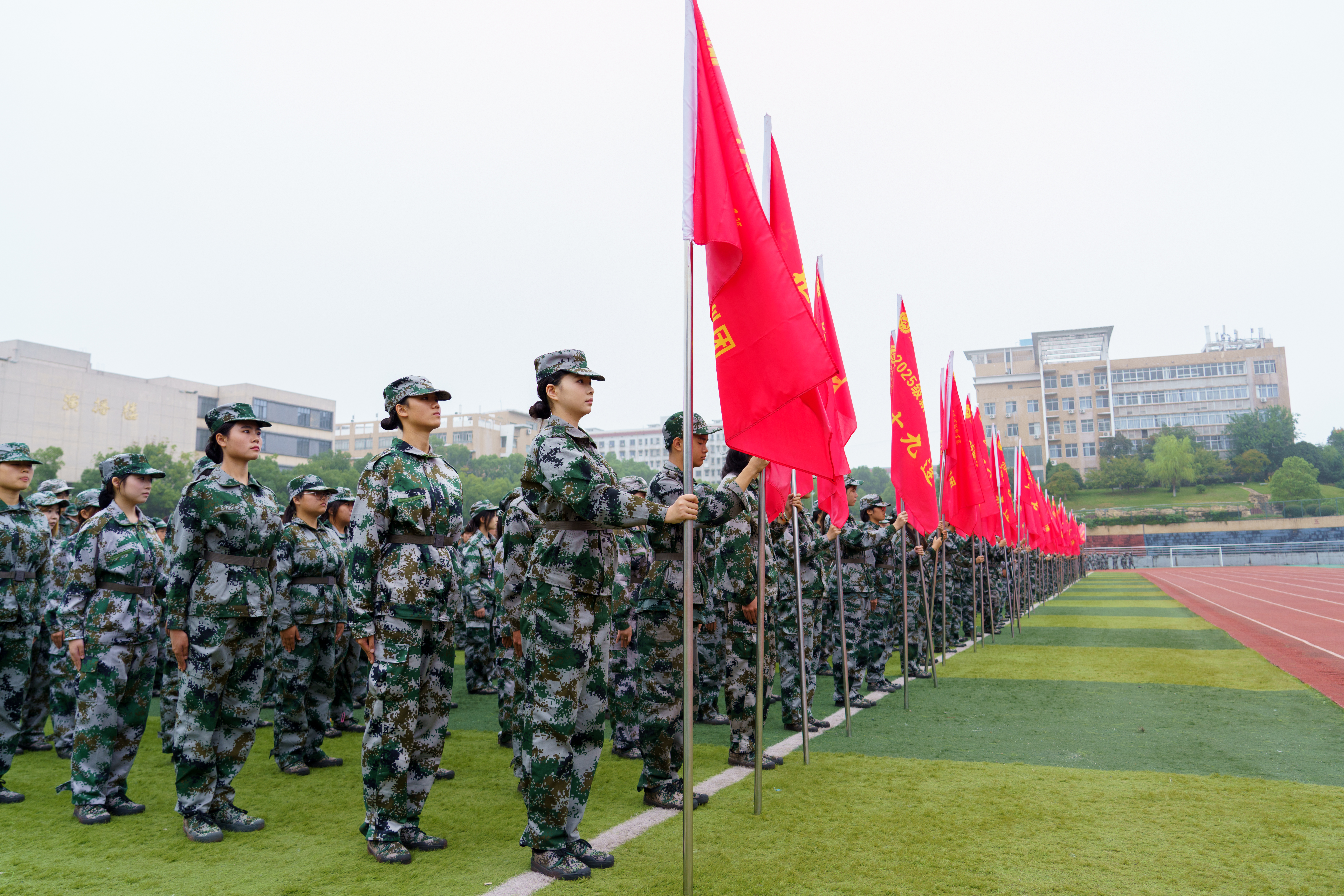 朱丹做军训总结讲话,他勉励全体新生将军训经历转化为今后学习、生活的三种力量:一是终身受用的执行力,像瞄准靶心般精准规划人生目标;二是温暖彼此的协作力,与队友能同频共振;三是穿透困境的耐受力,用意志突破所有极限。