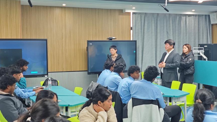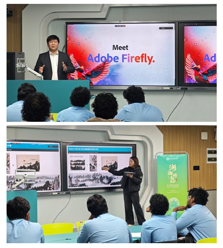 12月15日,倪栋、唐楷两位教授带来“人工智能在数字媒体艺术创作中的应用”专题课程。课堂上,倪栋教授系统介绍了Microsoft Copilot、Adobe Firefly等AI工具的核心功能,从文本生成图像、智能人像调整到视频自动剪辑,全方位展示AI对创作效率的提升。唐楷教授以“紫云山下磨刀翁”画展数字展示、“世纪动脉,万里茶道”数字化展陈等湖湘文化IP案例,生动诠释AI与传统文化的创新融合——传统国画经AI重构为超宽幅全景数字动画,茶文物联展通过无接触体感交互让观众沉浸式体验茶道魅力。让外国学子们深刻感受到数字媒体艺术传承文化、连接大众的独特价值。