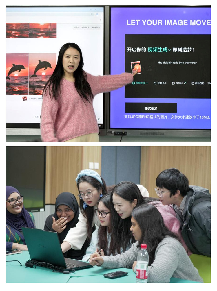 “主体+动作+场景+风格”——随着文生图提示词公式的揭晓,学子们在学姐助教的带领下分组协作,发挥想象力构思独特指令。从“a dolphin jumping at sunset”的经典示例,到融入马尔代夫文化元素的个性化创作,大家纷纷尝试用英文精准描述创意,一键生成高清2K图片。当看到文字描述瞬间转化为绚丽画面,来自不同国家的学子们不禁惊叹AI技术的神奇。在图生视频环节,大家体验即梦AI工具的便捷操作,生成动态短片。通过串联镜头、生成转场视频,学子们完成了抽象短片创作,部分作品还通过#AIFirstVideo #ChinaAI等标签分享至国际社交平台。