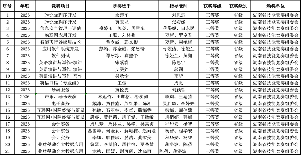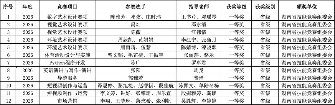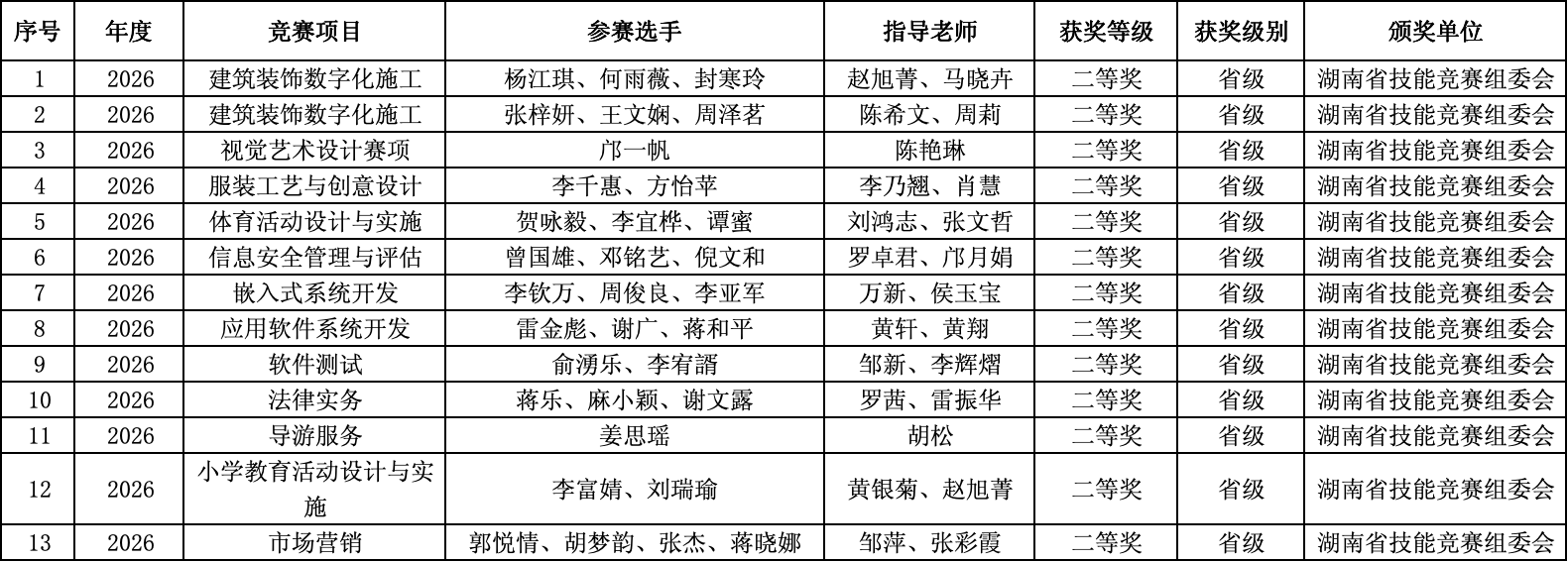 (教务处 王婵婷供稿)2月7日,2026年“楚怡杯”湖南省职业院校技能大赛多个赛项落下帷幕。我校70支参赛队伍、181名选手驰骋赛场,共斩获46项奖项,其中一等奖12项、二等奖13项、三等奖21项。