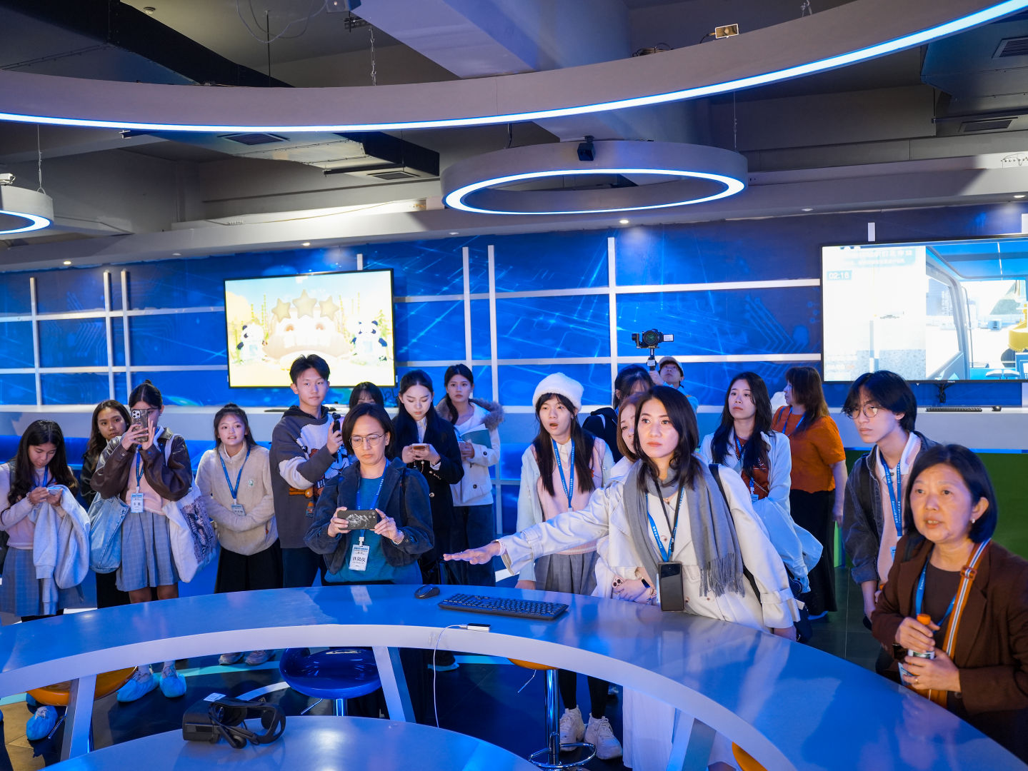 开班仪式结束后,研修班一行参观了全媒体实训室、新媒体技术学院、影视艺术学院,实地体验了虚拟演播系统、全息投影等教学实践设备,观摩了AIGC内容生成、智能剪辑辅助、虚拟数字人制作等AI技术在教学中的实践成果。