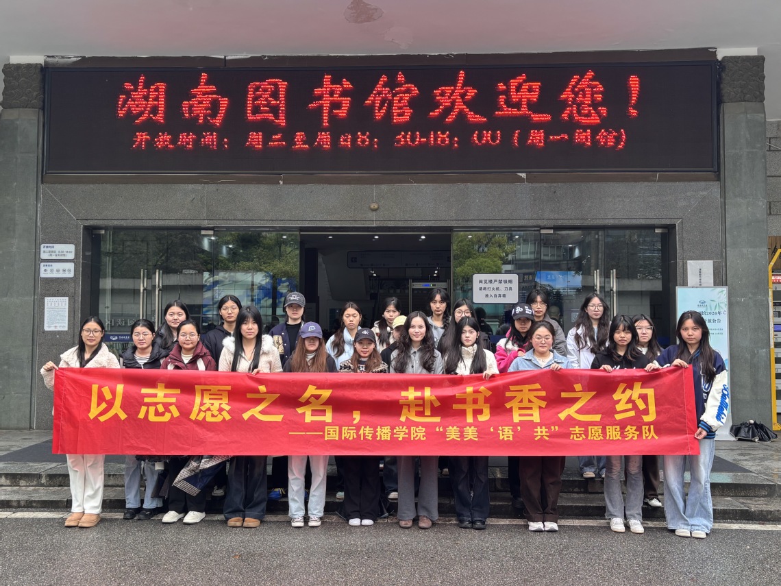 (国际传播学院杨键川、李绮思供稿)为大力弘扬志愿精神,深化实践育人成效,以青春行动传承践行雷锋精神,3月31日,我校国际传播学院 “美美‘语’共” 文旅志愿服务队走进湖南图书馆,开展 “以志愿之名,赴书香之约” 主题志愿服务活动,为书香场馆注入青春温暖力量。