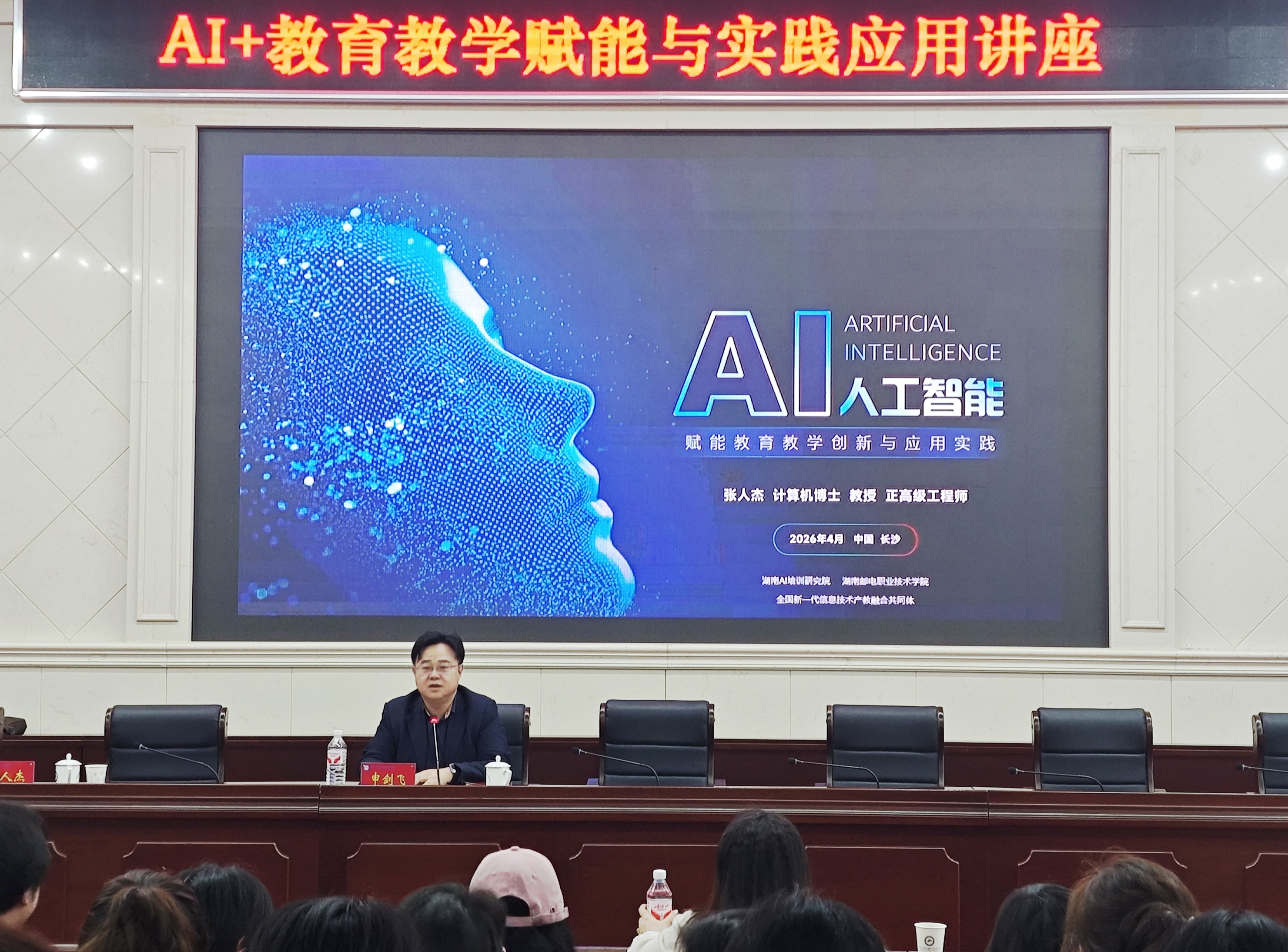 (教务处 田贵铭供稿)4月7日下午,我校举办“AI+教育教学赋能与实践应用”专题讲座,湖南邮电职业技术学院AI培训研究院院长、湖南电信通服培训公司数智部主任张人杰教授担任主讲嘉宾,副校长申剑飞主持讲座。学校300余名教师参与培训。