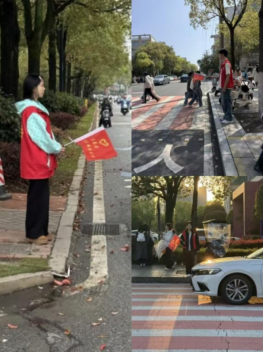 校园周边人流、车流密集,高峰时段通行压力不小。志愿者们每天分四个高峰时段轮流值守,在四大重点点位“打卡”。他们手持引导旗,耐心引导行人走斑马线、过天桥,劝阻非机动车逆行、闯红灯等不文明行为。“请走天桥”“红灯请等待”,一句句暖心提醒,让“文明出行、安全相伴”的理念悄然入心。同学们也在服务中收获了成长——规则意识、沟通能力和责任感统统“拉满”。